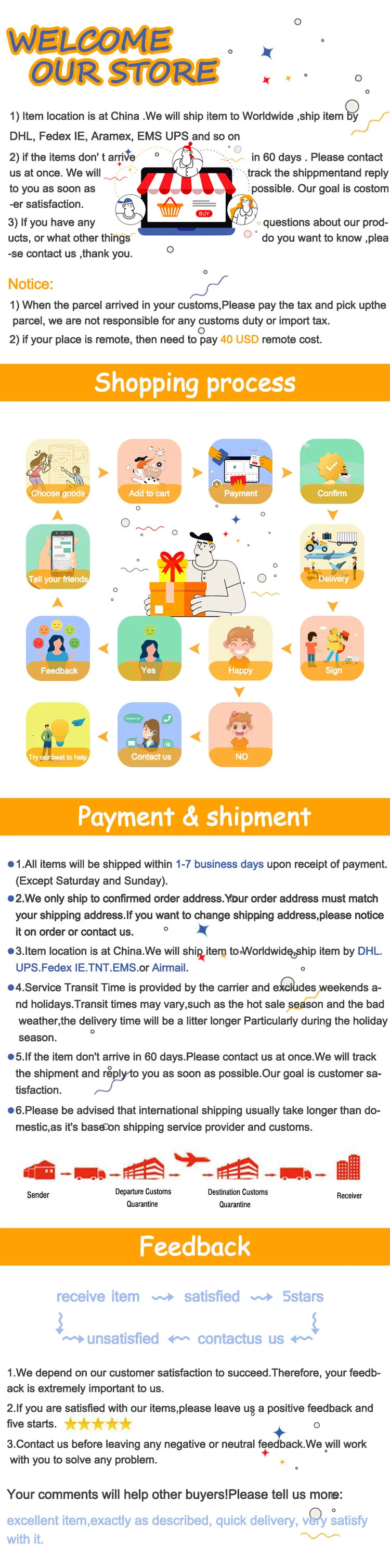2.When the parcel arrives at your local customs, please pay the tax and take the parcel away. We do not bear any customs duties or import taxes. If the customs fails due to the buyer's reasons and the goods are returned or destroyed, we will not refund any money.