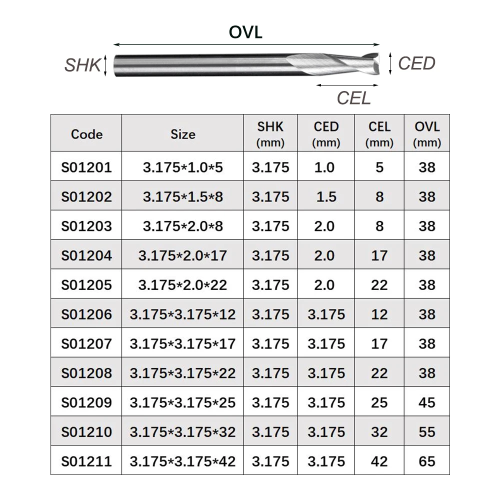 Dimensions ---- shank diameter: 1/8" (3.175mm); cutting edge diameter,cutting edge length/flute length,overall length As the Size Table.