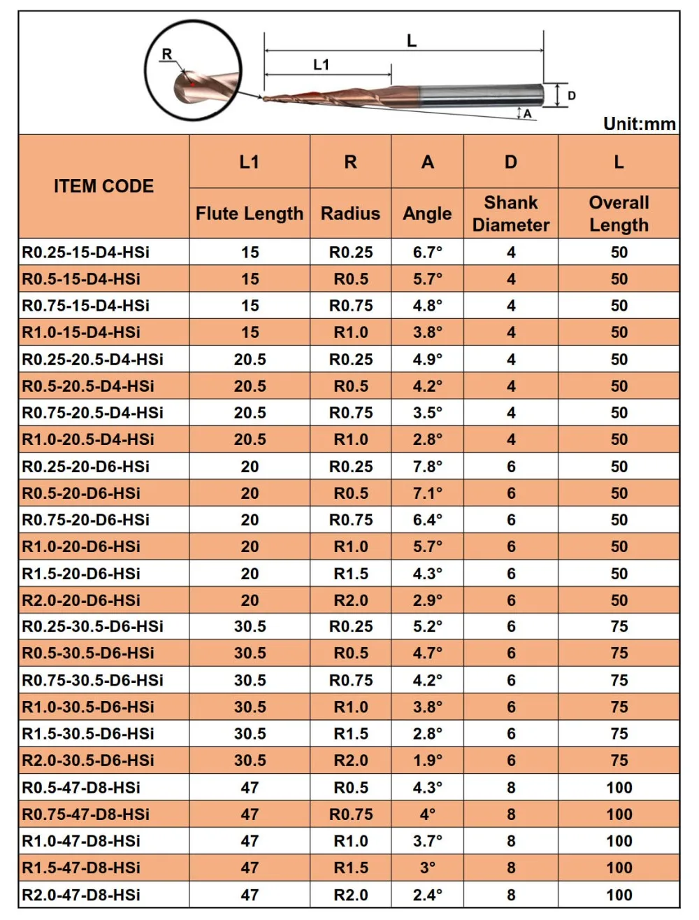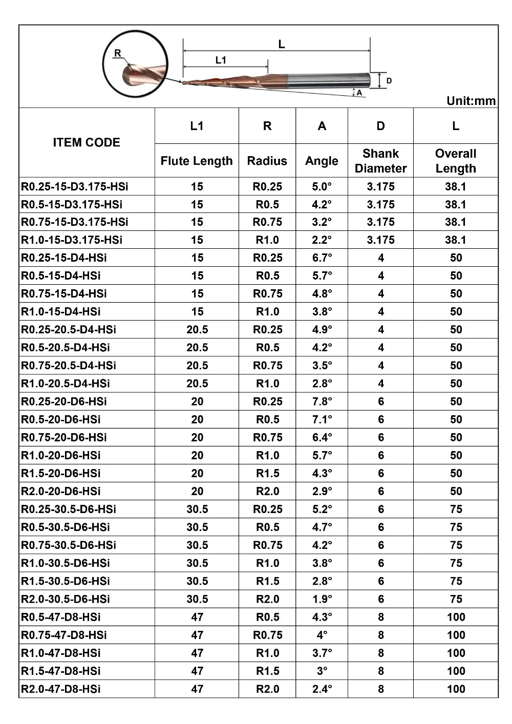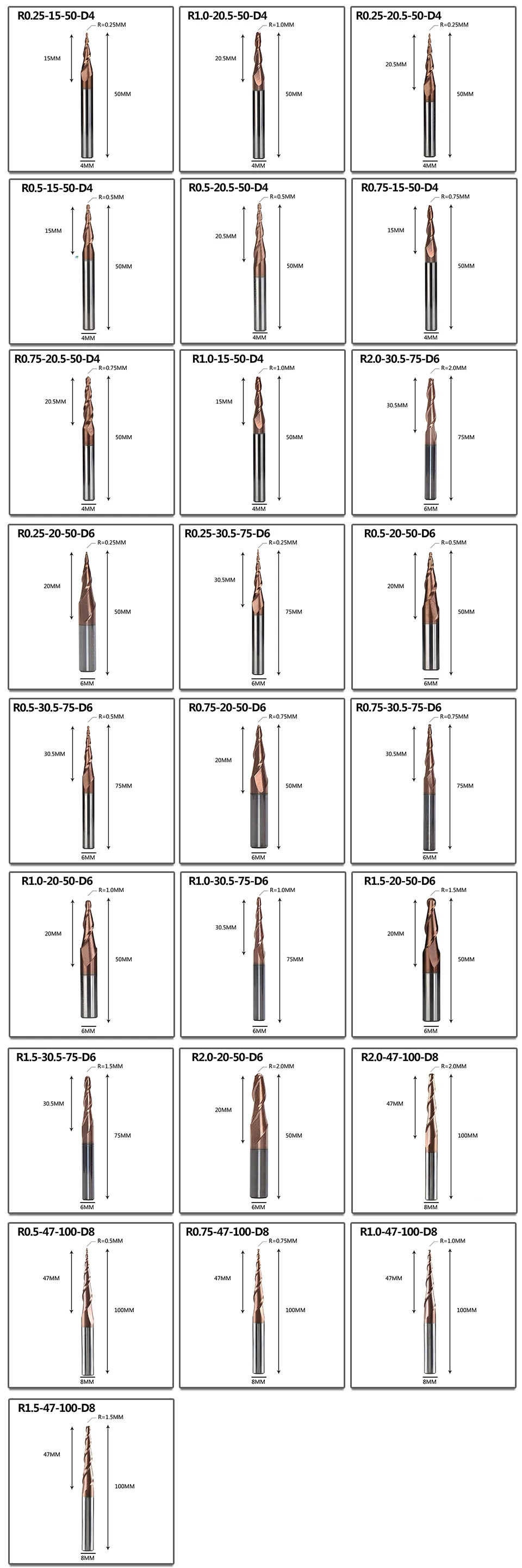 MORE DIMENSIONS OF TAPERED BALL NOSE END MILLS: