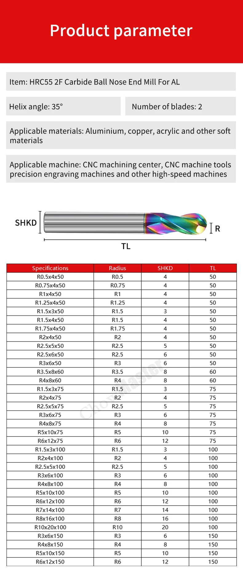 Diameter: R0.5/0.75/1/1.25/1.5/1.75/2/3/4/5/6/7/8/10