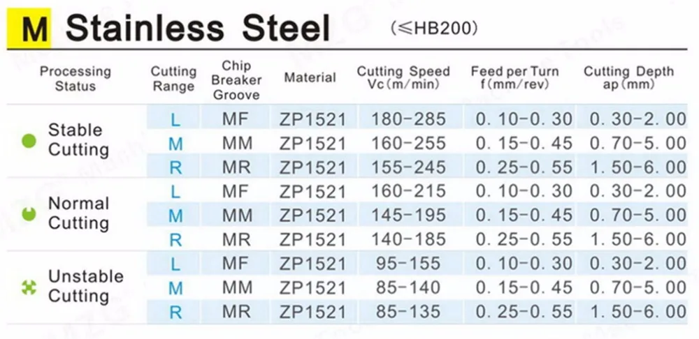 MZG Tungsten Carbide Inserts Cutting Parameter Recommend