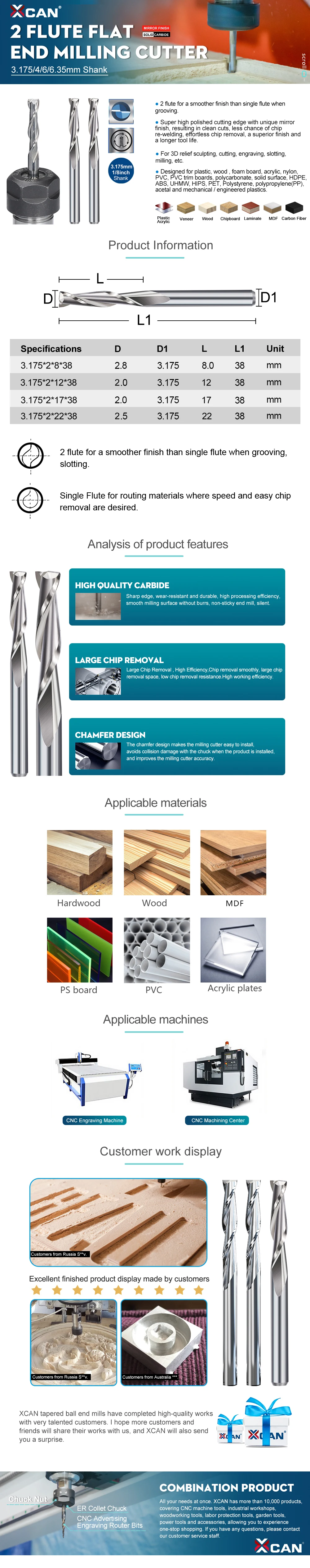 Features:1. High strength and hardness.2. Easy to carry and store.3. Durable in use.4. Suitable materials: Nylon, Resin, ABS, Acrylic, PVC, MDF, hardwood and other three-dimensional sculpture, surface machining etc.5. For 3D relief sculpturing, cutting, engraving, slotting, milling, etc.Specification:Type: Two Flute Flat End MillsMaterial: CarbideCutting Diamension: 2.0mmCutting Length: 8/12/17/22mmShank Diamension: 3.175mmTotal Length: 38mmHardness: 87Application: Suit for Cutting Wood , Plastic, Acrylic platePack Including: 10pcs Flat End MillsNote:Please allow 1-3mm error due to manual measurement.Due to the difference between different monitors, the picture may not reflect the actual color of the item.Package Including:1pc Flat end mill
