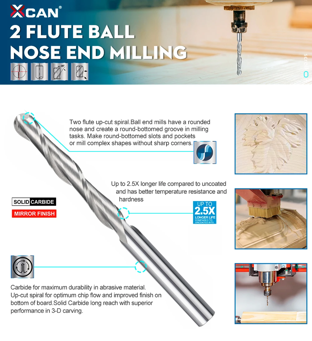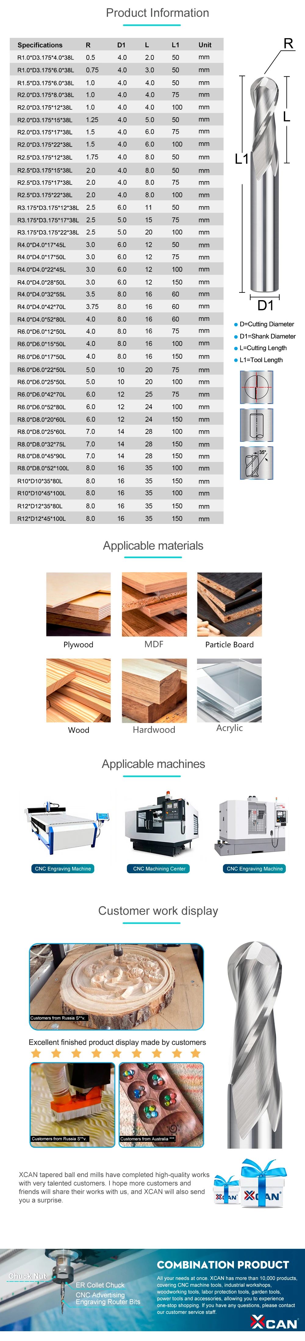 XCAN 3.175 Shank Ball Nose Milling Cutter 0.8-3.175mm Diameter CNC Router Bit Carbide End Mill for Woodworking Milling ToolsFeatures:1. Non stick knife, tasteless, quiet, blade design, sharp2. Clean, tidy, no burr3. Spiral chip design, chip smooth, reduce heat4. Applies to the relief process of sub GREE, PVC, density board, hard woodSpecification:Type:Spiral ball end millMaterial: CarbideShank: 3.175mmApplication: Suit for cutting Wood , Plastic, Acrylic platePackage Including:1pc Spiral ball end mill